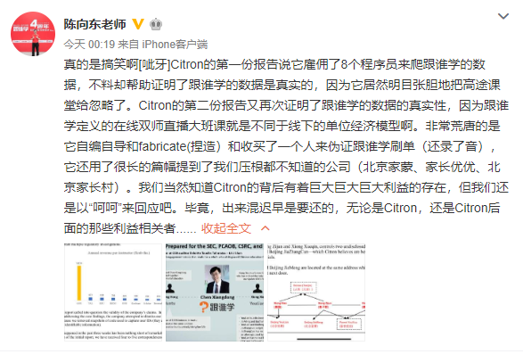 跟谁学创始人陈向东也通过微博发声:真的是搞笑,我们知道Citron的背后有着巨大巨大巨大利益的存在,但我们还是以“呵呵”来回应吧。