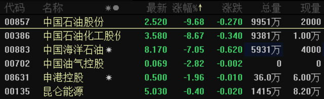 中国石油港股跌9.68%,中国石化港股跌8.67%、中海油跌7.05%。