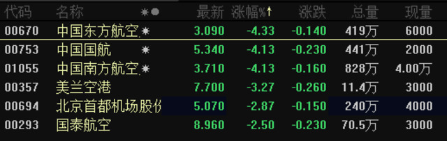 显然,巴菲特的清仓举措对于航空股来说是一个重大的负面利空。一方面受到巴菲特清仓的影响,一方面受到港股大盘的打压,今日港股航空板块走势是这样的: