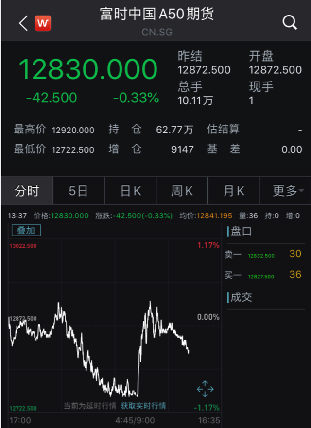 不过,在五一盘中暴跌5%后,海外交易的富时A50期货指数今日表现平稳,开盘向上拉升,一度从下跌1%到上涨0.2%以上。