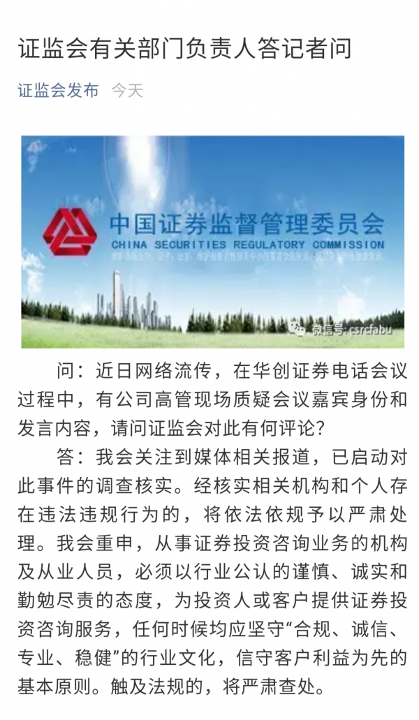 2月21日下午,证监会官微发布有关部门负责人答记者问,对华创证券电话会议邀请假高管事件作出回应。该负责人表示,证监会已启动对此事件的调查核实。经核实相关机构和个人存在违法违规行为的,将依法依规予以严肃处理。证监会重申,从事证券投资咨询业务的机构及从业人员,必须以行业公认的谨慎、诚实和勤勉尽责的态度,为投资人或客户提供证券投资咨询服务,任何时候均应坚守“合规、诚信、专业、稳健”的行业文化,信守客户利益为先的基本原则。触及法规的,将严肃查处。