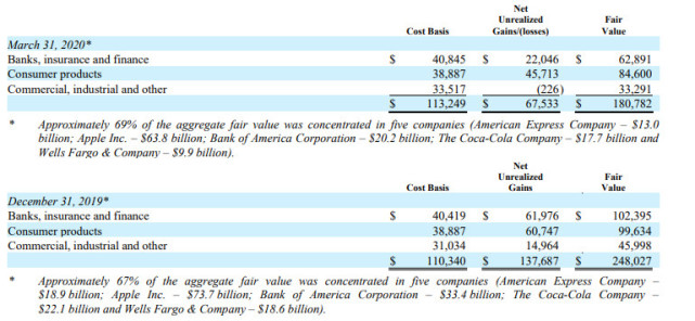 截至2020年3月31日,伯克希尔哈撒韦持有股票公允价值的69%集中于五大重仓股(苹果638亿美元、美国银行202亿美元、可口可乐177亿美元、美国运通130亿美元、富国银行99亿美元)。截至2019年12月31日,伯克希尔哈撒韦持有股票公允价值的67%集中于五大重仓股(苹果737亿美元、美国银行334亿美元、可口可乐221亿美元、美国运通189亿美元、富国银行186亿美元)。