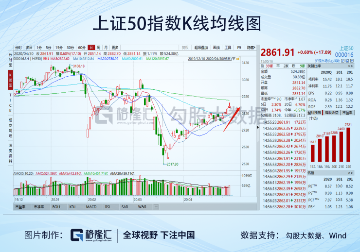 而代表大盘白马股的上证50,节前“四连阳”,也是多头突破的走势。唯120日均线处有一定压力,而突破这重压力需要再震荡几个回合。