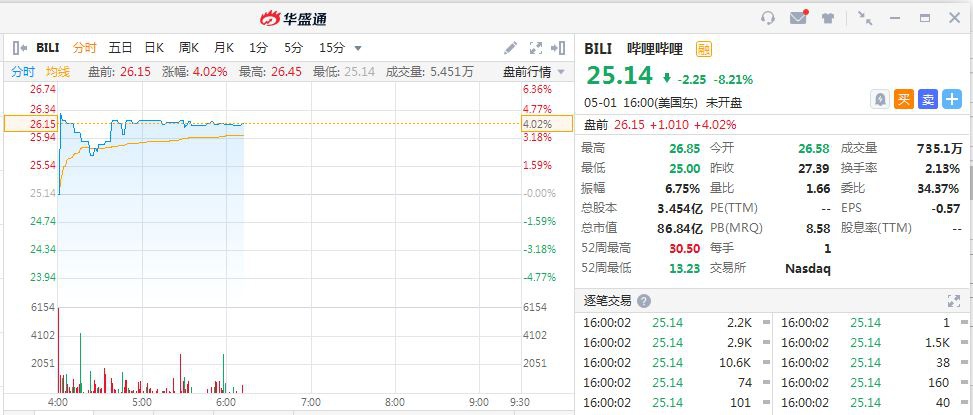 B站(BILI.US)盘前涨逾4% 昨日《后浪》视频成爆款