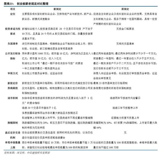 创业板的新交易制度更加打击投机。创业板五个交易日后的涨跌幅限制扩大为20%,波动更大,封板更为困难。此外,创业板新规定“限价申报单笔数量不超过10万股,市价申报单笔数量不超5万股”,而老规定为“单笔申报最大数量应当不超过100万股”,封板也更加困难。新规还增加了连续竞价期间的“价格笼子”规定,连续竞价阶段限价申报的买入申报价格不得高于买入基准价格的102%,卖出申报价格不得低于卖出基准价格的98%。这可有效对拉抬打压股价等异常交易行为加以抑制。
