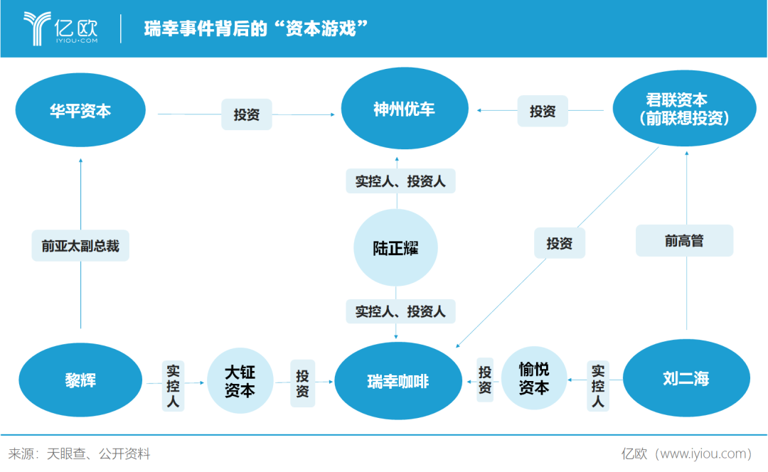 神州租车赴港IPO前,刘二海代表君联资本、黎辉代表华平投资,分别对神州租车进行了投资。神州租车上市之时,两人均为神州租车董事。而在瑞幸咖啡上市后,黎辉所在的大钲资本持股11.9%、刘二海所在的愉悦资本持股6.75%,这一“资本铁三角”选择了再次强强联手。