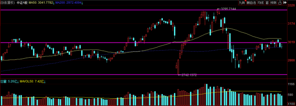 中证A股指数今天缩量小幅收涨0.13%,盘中来回窄幅震荡,下方在200天均线附近似有支撑。不过,行情依旧还是上涨缩量、下跌放量,这种行情不太好赚钱。