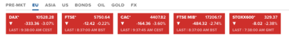 欧股开盘也全线跳水,欧洲斯托克50指数跌2.97%,德国DAX30指数开盘跌2.38%,意大利富时指数开盘下跌3.37%,法国CAC40指数开盘下跌3.13%。