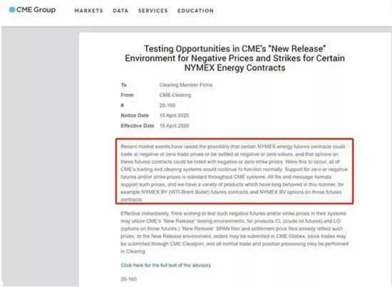 4月3日,芝商所通知,修改了IT系统的代码,允许“负油价”申报和成交,4月5日生效。4月8日,芝商所公告称,如果主要能源交易品种价格跌为负值,将清算所有测试计划,以保证市场正常运行。