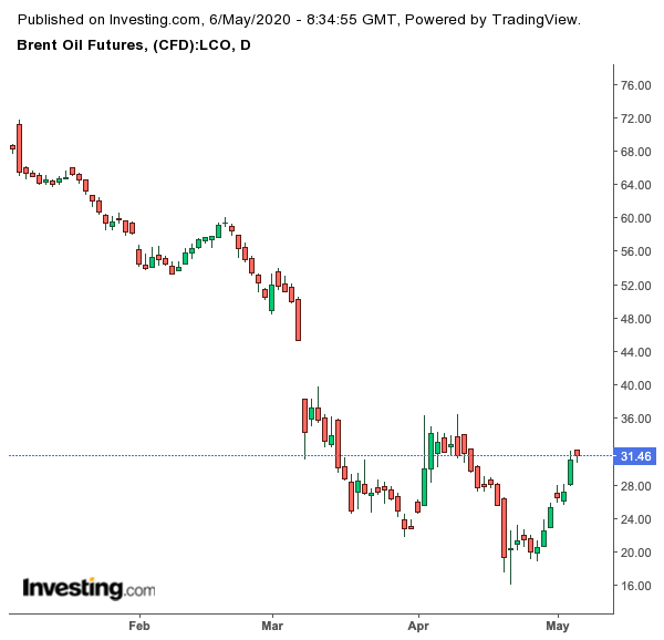 同日,布伦特原油期货价格也上涨了14%,自4月7日以来连续上涨6天,累计涨幅达到了55%,触及32.18美元的高点,为4月14日以来最高收盘价。