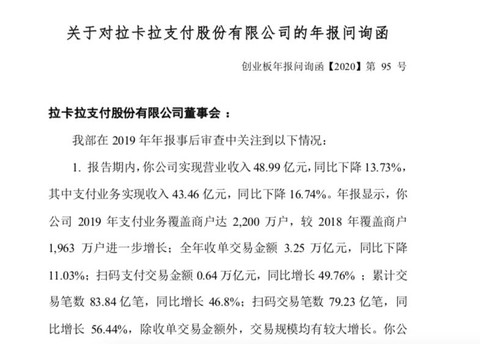 4月30日,A股上市公司拉卡拉(300773)收到深交所年报问询函。据拉卡拉发布公告显示,深交所针对拉卡拉2019年相关业绩,贷款引流,金融业务等方面提出疑问。