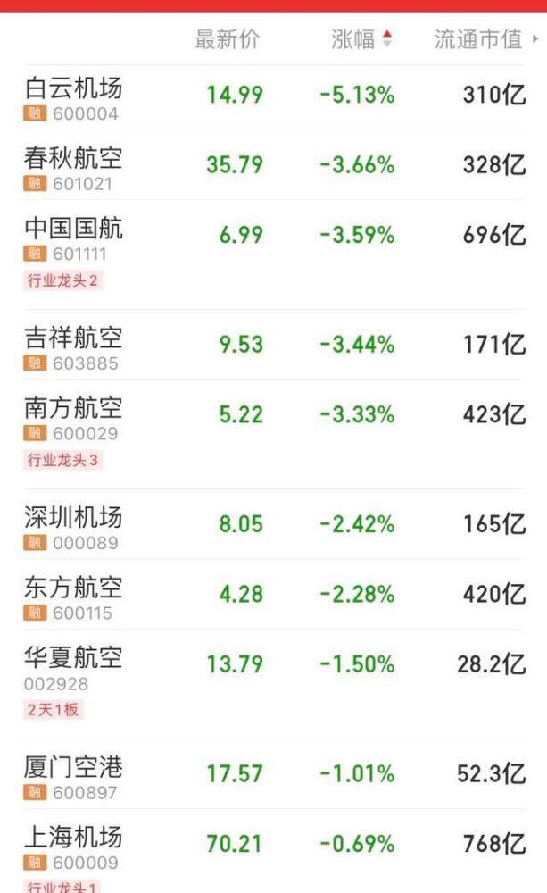 其中,行业龙头中国国航下跌3.59%,报价6.99元/股,市值一天之内蒸发了25.9亿。