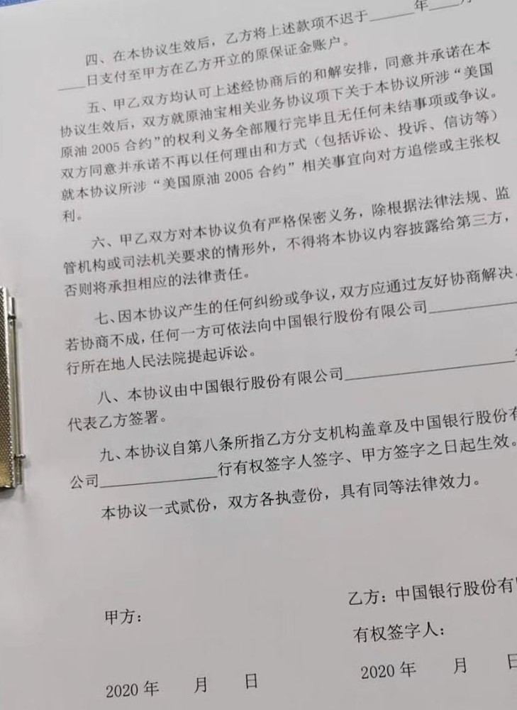 5月5日,多名原油宝投资者反映称收到中行致电,要求沟通协商方案事宜;第二天,收到中行致电的原油宝投资者显然多了起来,和解协议原件进一步曝光。