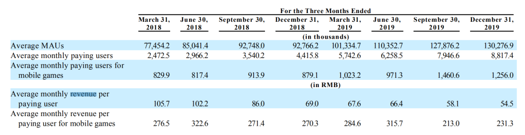 数据显示,近年来B站的每用户每月付费金额(Average monthly revenue per paying user)正在减少。2018年第一、二、三、四季度的每用户每月付费金额分别为105.7元、201.2元、86元、69元,而到2019年相应数字则变为67.6元、66.4元、58.1元、54.5元。