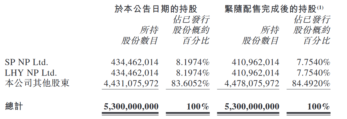 据悉,高盛已同意作为配售代理,促使承配人认购或(若未能促使认购)自行认购合共4700万股由SP NP Ltd.及LHY NP Ltd.持有的公司现有股份,共占据公司已发行股本总额的0.89%。