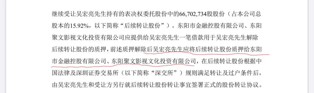 公告中提到,东阳市金融控股有限公司、东阳聚文影视文化投资有限公司将提供给吴宏亮一笔借款,以解除后续转让股份的质押。在质押解除后,吴宏亮应将该股份质押给借款方。