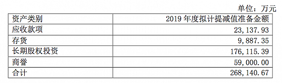 华谊兄弟表示,经过初步测算,2019年公司拟对包括商誉,长期股权投资在内的部分资产计提减值准备共计约26.8亿元,其中,商誉减值准备金额为5.9亿元,长期股权投资拟计提减值准备金额高达17.6亿元。