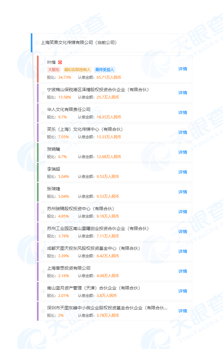 天眼查信息显示,笑果文化目前有13位股东,分别是叶烽、宁波梅山保税港区泽禧股权投资合伙企业(有限合伙)、华人文化有限责任公司、笑乐(上海)文化传媒中心(有限合伙)、贺晓曦、李瑞超(就是李诞)、张瑛婕、苏州骏赐股权投资中心(有限合伙)(也是华人文化旗下的股权投资基金)、苏州工业园区南山星曜创业投资合伙企业(有限合伙)(这是南山资本旗下的股权投资基金)、成都天图天投东风股权投资基金中心(有限合伙)和深圳市天图东峰中小微企业股权投资基金合伙企业(有限合伙)(这两个都是天图资本的)、王思聪的上海普思投资和南山蓝月资产管理(天津)合伙企业(有限合伙)。