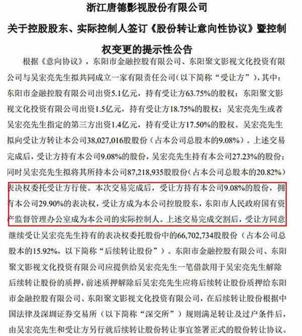 该公告显示,唐德影视或将“卖身” ,东阳市国资办拟接盘成为实控人。