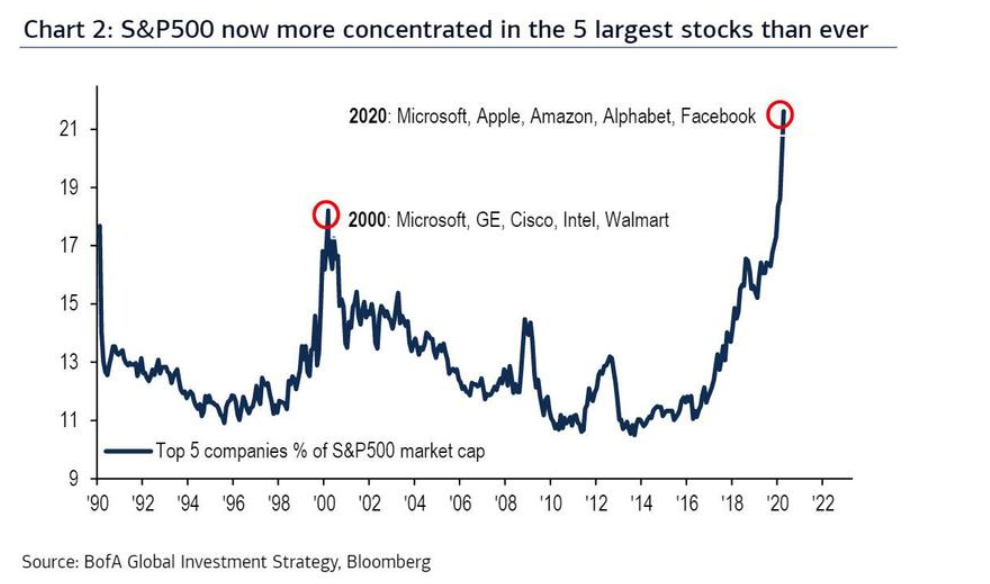 高盛的一篇报告指出,“标普500现在只是靠少数几只大型股票支撑,其中最大的5只股票现在占到市值的22%,这一比例甚至比互联网泡沫时期还高。”