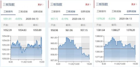 截至4月13日收盘,三板做市报1051.91点,下跌0.05%;三板成指报957.15点,下跌0.19%;三板创新成指报1378.20点,下跌0.25%。
