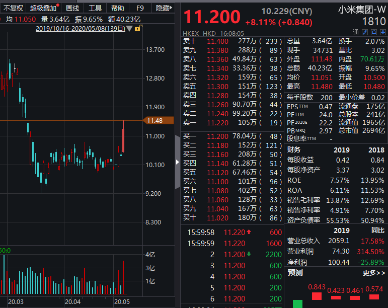 小米集团今日大涨8.1%,一度涨超10%刷新近2个月高位,收盘价11.2港元,总市值为2694亿港元。自公共卫生事件后,小米零售在首个小长假迎来了线下经济的整体复苏。
