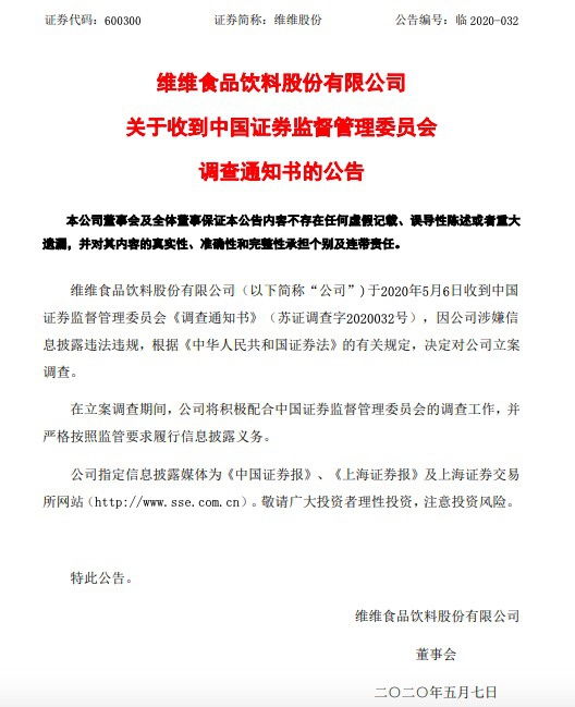 央广网北京5月8日消息(记者宓迪)近日,上市公司维维股份发布公告称,维维食品饮料股份有限公司于2020年5月6日收到中国证券监督管理委员会《调查通知书》(苏证调查字2020032号),因公司涉嫌信息披露违法违规,根据《中华人民共和国证券法》的有关规定,决定对公司立案调查。