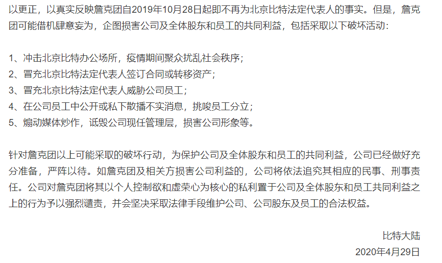 5月8日下午,北京比特官方回应称:目前,詹克团已不在“北京比特”担任任何职务。市场监管部门公示登记显示詹克团为我司法定代表人属于登记错误,且严重违反《公司法》的规定。詹克团冒充“北京比特”法定代表人违法从事的任何行为,我司均不予承认,并保留追究詹克团及相关方法律责任的权利。