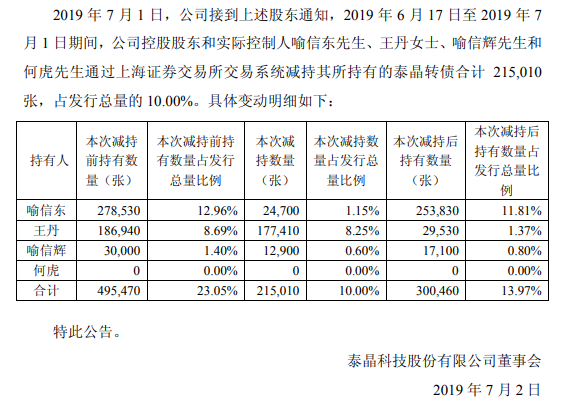 2018年2月28日,泰晶科技发布公告称,公司控股股东和实控人喻信东、王丹、喻信辉和何虎四人在二级市场合计减持了224430张可转债,占总发行量的10.44%。至此,四人的减持之路开始了。2019年3月5日、3月14日、7月2日,泰晶科技分别发布公告称,四人连续减持了30%的可转债。4次减持后,最终持有比例只剩13.97%。