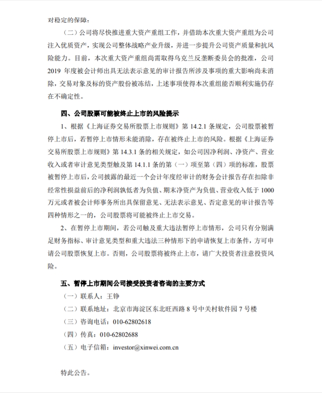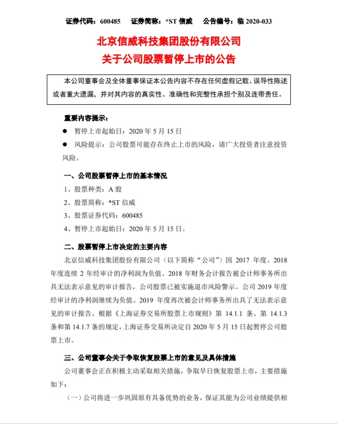 *ST信威(600485)5月8日晚间公告,公司因2017年度、2018年度连续2年净利润为负值、2018年财务会计报告被会计师事务所出具无法表示意见的审计报告,公司股票已被实施退市风险警示。公司2019年净利润继续为负值、2019年度再次被会计师事务所出具了无法表示意见的审计报告。上海证券交易所决定自5月15日起暂停公司股票上市。