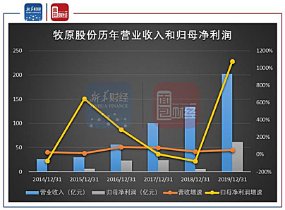 资本市场也非常看好猪养殖行业中的龙头企业,牧原股份的股价在2019年内上涨超2倍,最新市值已经逼近万科,前者为2726亿元,后者为2935亿元。在2019年福布斯中国富豪榜上,牧原股份创始人秦英林家族身价暴涨了900亿,排名第九名。
