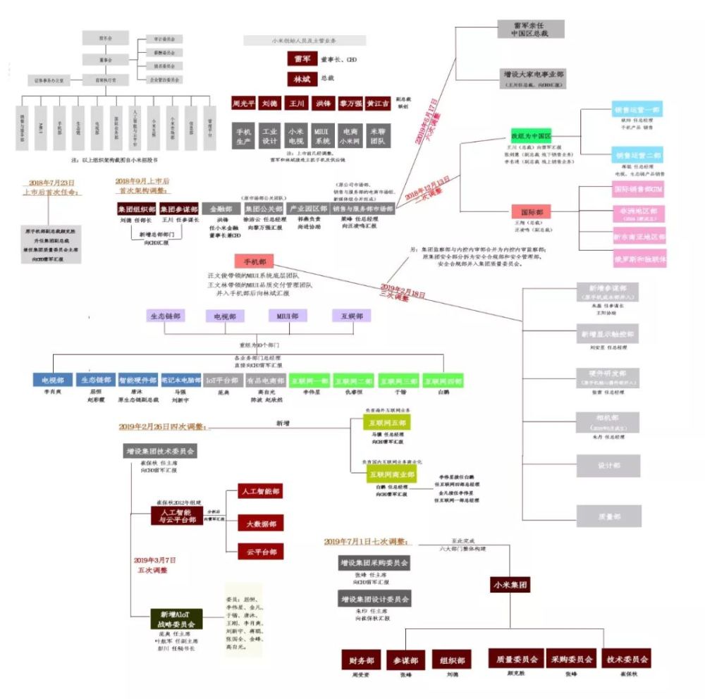 在过去,小米的组织结构曾长期稳定。基本格局是雷军亲自负责手机业务,几位联合创始人分管小米网和销售、生态链、电视业务、MIUI等。在上市之前,雷军将手机业务交给担任总裁的林斌;上市后两位创始人刘德和洪锋淡出,生态链部门重新任命并进行了业务分拆,MIUI部门也做了分拆。