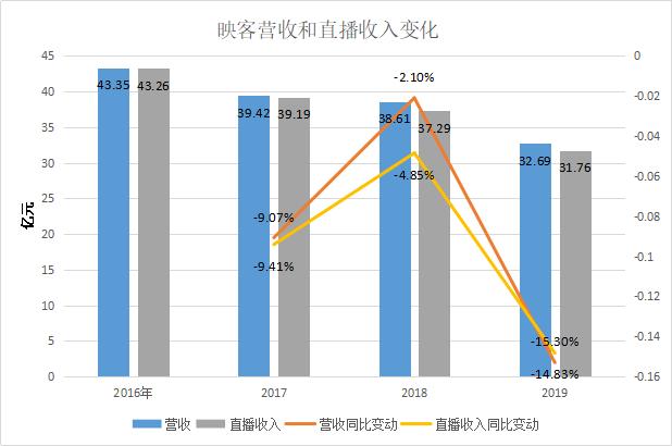 财报数据显示,映客2019年的总营收为32.69亿元,同比下降15.3%,创披露数据以来的最大跌幅。这一年,虎牙、斗鱼的营收增速均在70%以上。实际上,自2016年以来,映客的总营收就一直呈现下滑趋势,从2016年的43.35亿元降至2019年的32.69亿元。