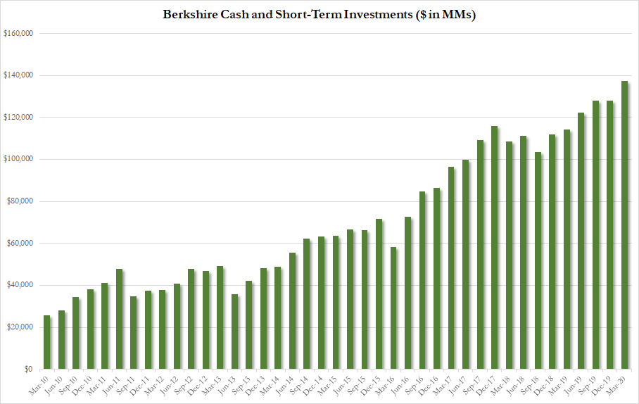 此外,近年来巴菲特的投资被质疑,原因在于美股长牛但伯克希尔却囤积了越来越多的现金。截止一季度末,伯克希尔账面上现金达到创纪录的1370亿美元,比去年底又高了大约100亿美元。