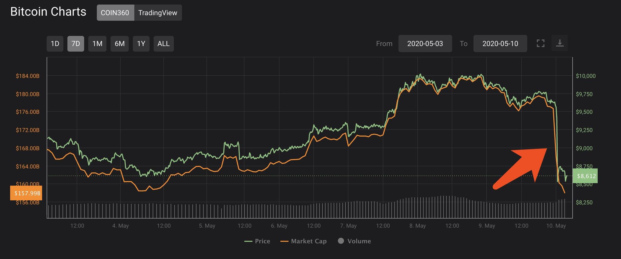 在突破1万美元后,比特币在5月9日维持在9700美元左右浮动,然而在格林尼治标准时间5月10日0点整(国内8点整),比特币价格突然直线下降,跌破9000美元!