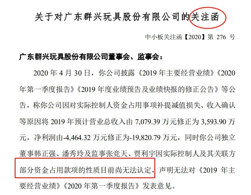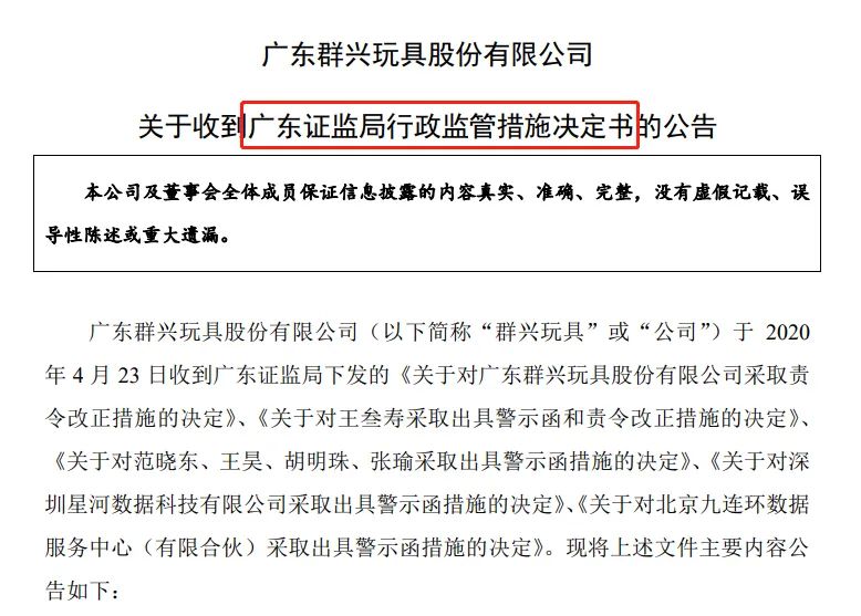 ST群兴公告,2020年4月23日收到广东证监局下发的《关于对广东群兴玩具股份有限公司采取责令改正措施的决定》、《关于对王叁寿采取出具警示函和责令改正措施的决定》、《关于对范晓东、王昊、胡明珠、张瑜采取出具警示函措施的决定》、《关于对深圳星河数据科技有限公司采取出具警示函措施的决定》、《关于对北京九连环数据服务中心(有限合伙)采取出具警示函措施的决定》。