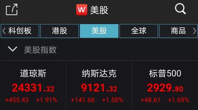 面对如此糟糕的数据,本以为美股会大跌,但隔夜美国三大股指期货短线小幅上扬,截至周五收盘,标普500指数收盘上涨48.60点,涨幅1.69%,报2929.80点;纳斯达克指数收盘上涨141.70点,涨幅1.58%,报9121.32点;道琼斯指数收盘上涨455.40点,涨幅1.91%,报24331.32点。