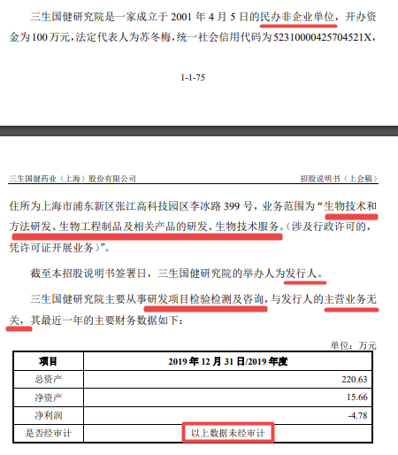 招股书披露,三生国健研究院的财务数据既没有审计,也没有合并报表。