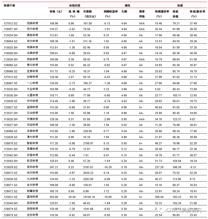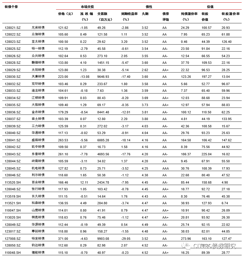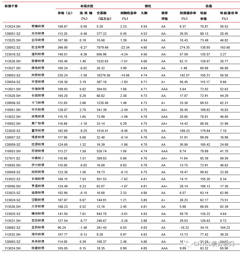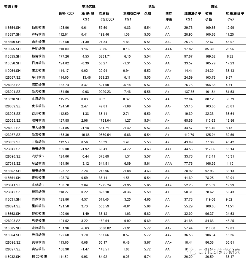 转债市场成交量下降,个券涨多跌少。上周中证转债指数报收于353.38点,周上涨0.92%;转债市场交易额3050.65亿元,日均环比下跌3.31%,转债指数收于116.47点,周上涨0.85%;平价指数收于87.14点,周上涨1.97%。CB指数收于204.32点,周上涨0.90%;CBEB指数收于220.42点,周上涨0.78%。上周在242支可交易转债中,除岩土转债横盘外,141支上涨,100支下跌,其中晶瑞转债(31.52%)、裕同转债(25.65%)、新莱转债(19.99%)领涨,孚日转债(-12.88%)、游族转债(-11.32%)、天康转债(-10.80%)领跌。成交额方面,模塑转债(162.50亿)、晶瑞转债(141.40亿)、通光转债(124.02亿)成交额居前。