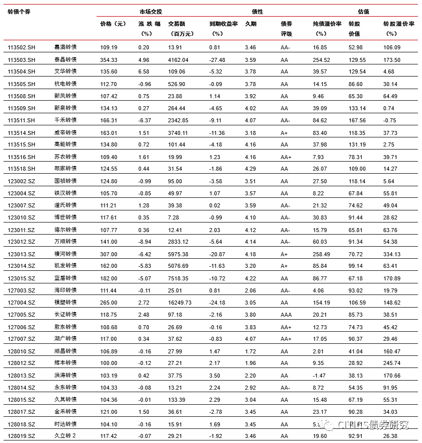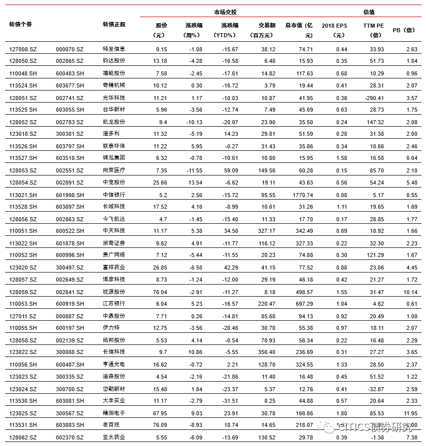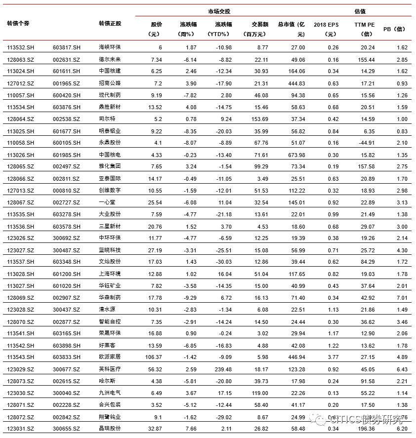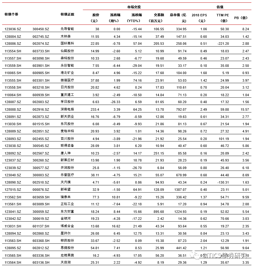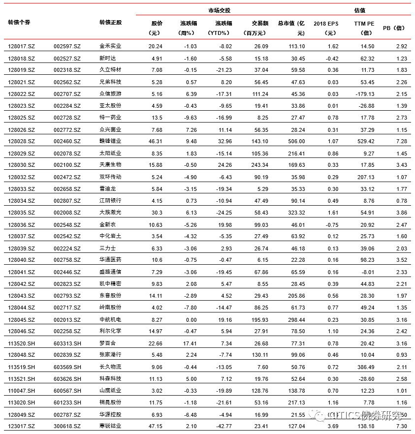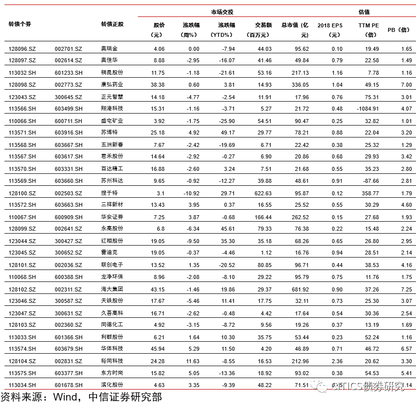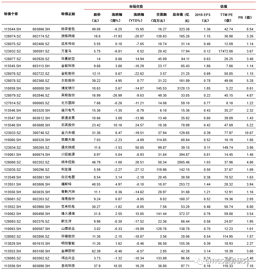 沪深两市同向变动,转债正股涨少跌多。上周上证综指上涨1.84%,沪深300上涨2.86%,沪深两市日均交易额4884.90亿元,沪深两市日均交易额环比下降3.64%。中信29个一级行业中,18个上涨,11个下跌;其中农林牧渔(4.12%)、食品饮料(2.86%)、餐饮旅游(2.79%)领涨,电子元器件(-4.06%)、综合(-3.24%)、非银行金融(-3.02%)领跌。上周在240支可交易正股中,除奥瑞金、先导智能、中航机电、澳洋顺昌和吉视传媒横盘外,103个上涨,132个下跌,其中至纯科技(18.55%)、梦百合(17.41%)、博威合金(16.62%)领涨,英联股份(-26.99%)、孚日股份(-26.33%)、游族网络(-11.93%)领跌。