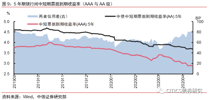上周银行间债券市场,AAA级银行间中票5年期YTM下降8bps,为2.90%,AA级YTM下降3bps,为3.70%,两者的信用利差为-79.78bps。