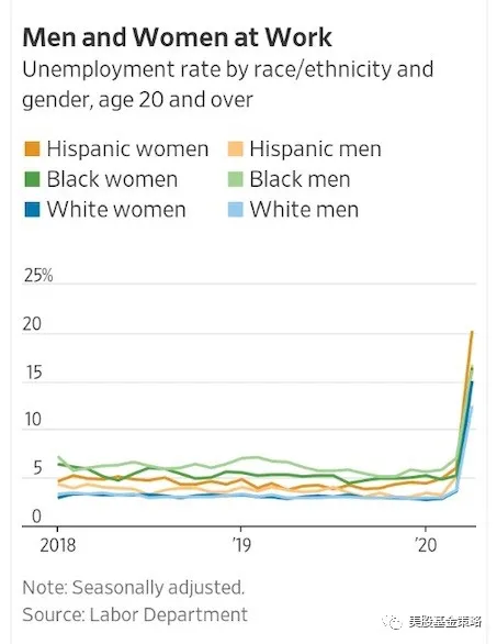 从种族和性别来看,西班牙裔和黑人的失业率更高,男女失业比例均高于均值,特别是西班牙裔妇女的失业率更达到了20%,原因也可以想见,她们往往从事的是相对低端的工作,这些工作受公共卫生事件更大,甚至大多就是涉及户外、实体场地的工作,很可能瞬间群体性失业。