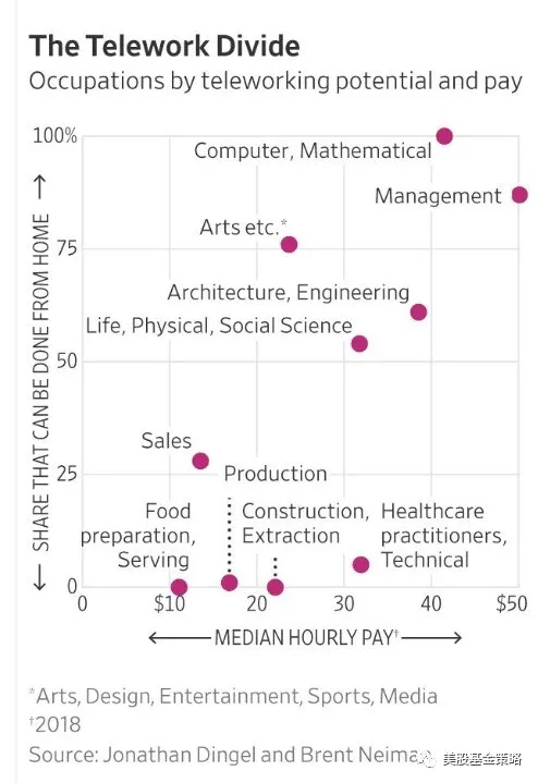 对于公共卫生事件对不同工作的影响,有上图这样的分析,即横轴是这类工作居家正常进行的可能性,显然一般的餐厅无法让厨师和服务生在自己家里给客户提供服务,正常做菜提供外卖是一个替代方案。而在建筑行业,设计师还算一定程度上可以继续在家中设计,但是建筑工人显然只能彻底停摆。而图中的横轴是2018年这些工作的中位数时薪,我们可以看到IT行业、管理行业薪资更高,同时,他们受公共卫生事件的影响相对较小,因为相关工作完全可以在家中进行。就如近期披露财报的公司来看,互联网公司受到的影响显然较小,一些在线业务甚至而昂扬向上。