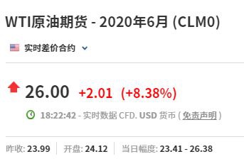 周四下午18.22,WTI原油6月期货涨超8%,现报26美元/桶。