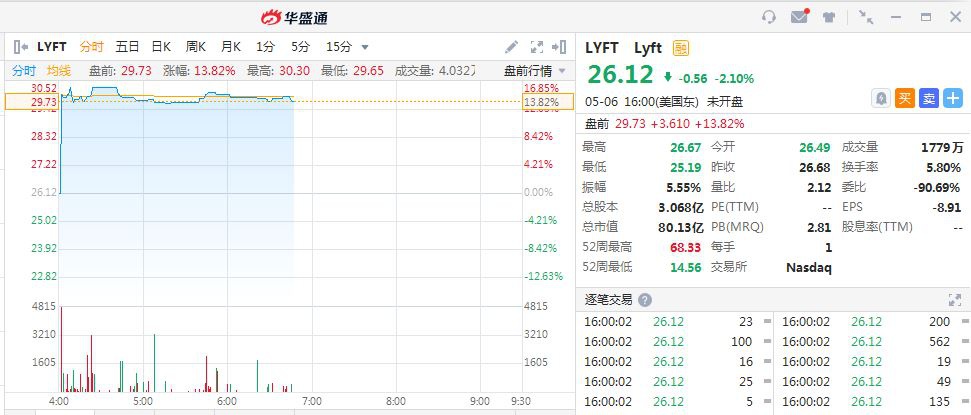 Lyft(LYFT.US)盘前涨14% Q1净亏损同比大幅缩窄至约4亿美元