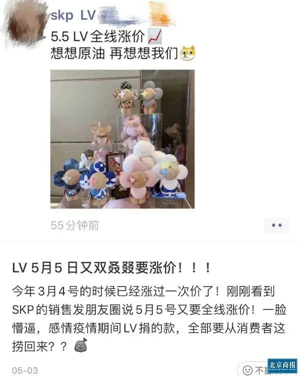 据北京商报,5月5日,小红书上不少时尚博主都在“控诉”LV近半年来的第二次涨价。“今年3月4日的时候已经涨过一次价了!刚刚看到SKP的销售发朋友圈说5月5号又要全线涨价!一脸懵,疫情期间LV捐的款,全部要从消费者这捞回来?”有博主甚至在两三天前就晒出了品牌销售“预警”涨价的聊天截图,证实消息来源可靠,提醒大家及早入手。