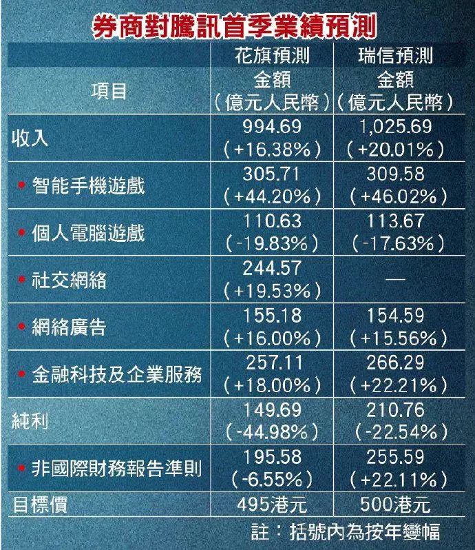 花旗估计腾讯首季个人电脑(PC)游戏收入会按年倒退近两成。华兴资本则指,涵盖腾讯云和微信支付的金融科技及企业服务分部,首季收入按年增速也会从前一季的39%骤跌至仅11%,原因是实体店休业打击流动支付交易之际,内地企业押后云端服务的开支。