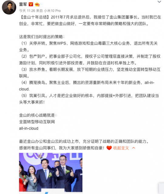 以下为雷军的金山十年总结: