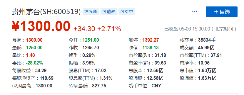 13年茅台最低股价 贵州茅台股价站上1300元