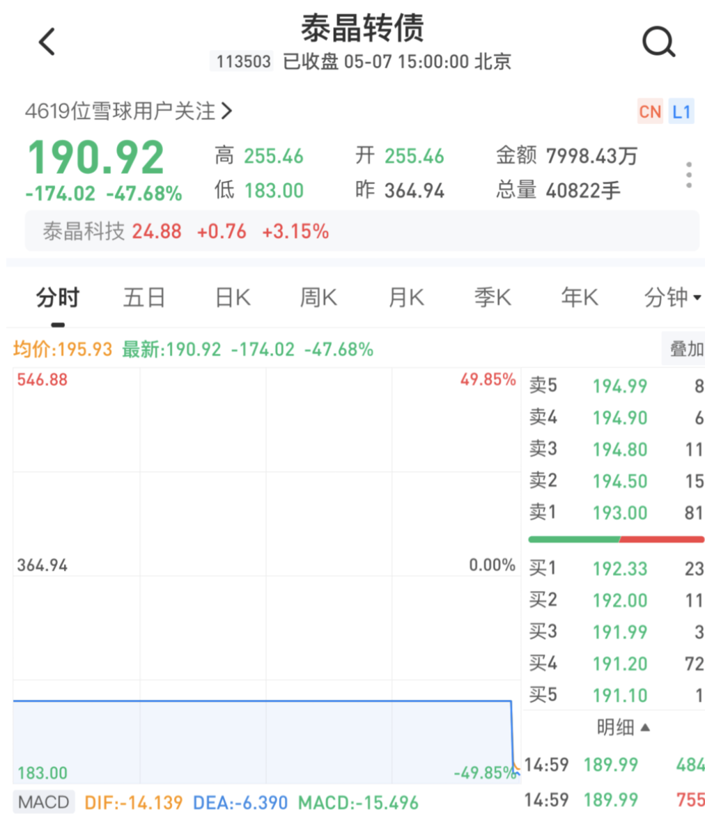 第三大坑发生在5月7日,可转债市场又出了一个惨案。泰晶转债因为公司提前强制赎回,转债价格在5月7日暴跌近48%。